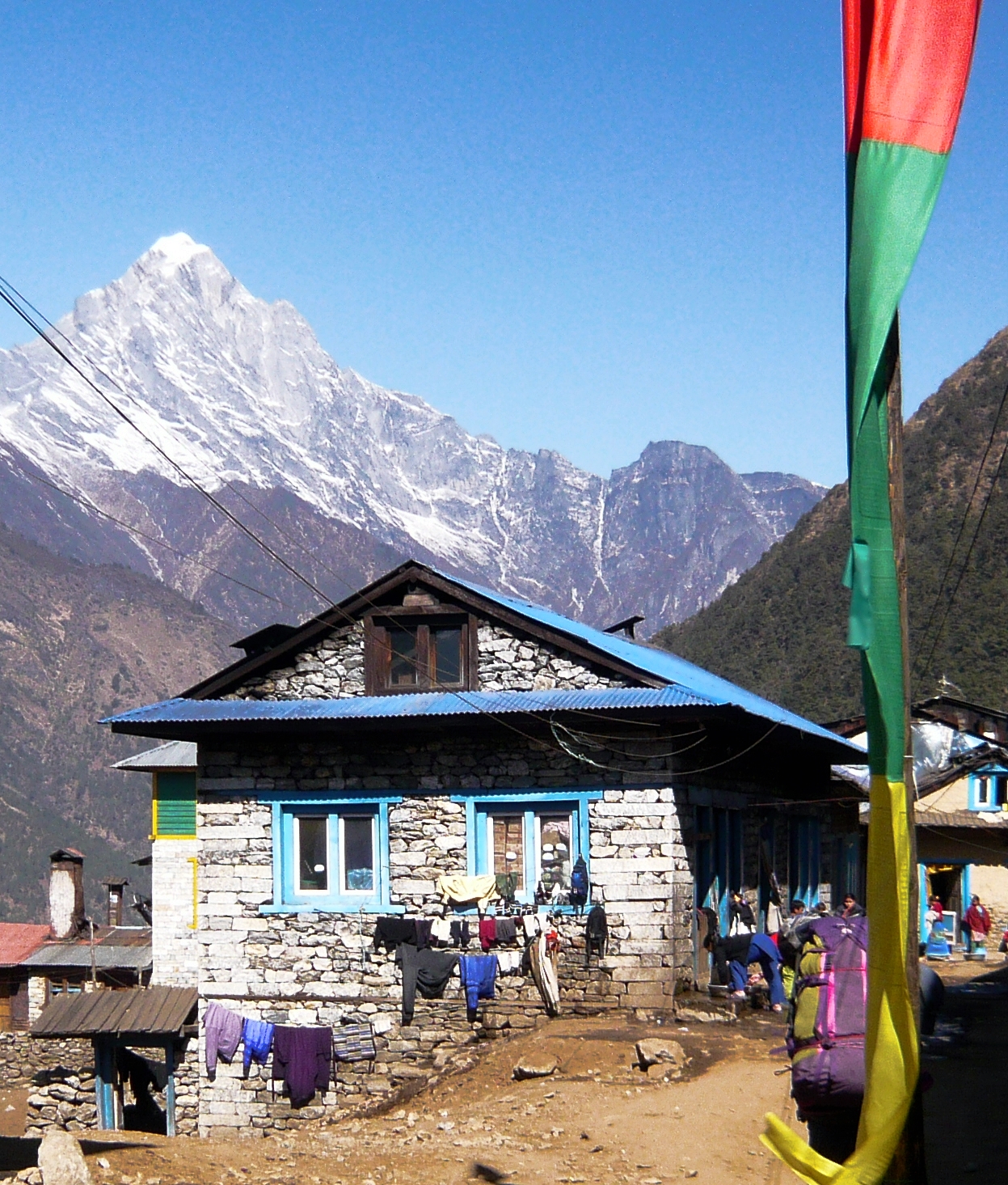 Village near Manang (posibly Mungji), on the Marsyandi River, close to the Annapurnas. In many ways, a typical Nepalese mountain village, it is built on man-made terraces, up steeply sloping mountainside, to avoid using any of the precious farmland available in the valley.