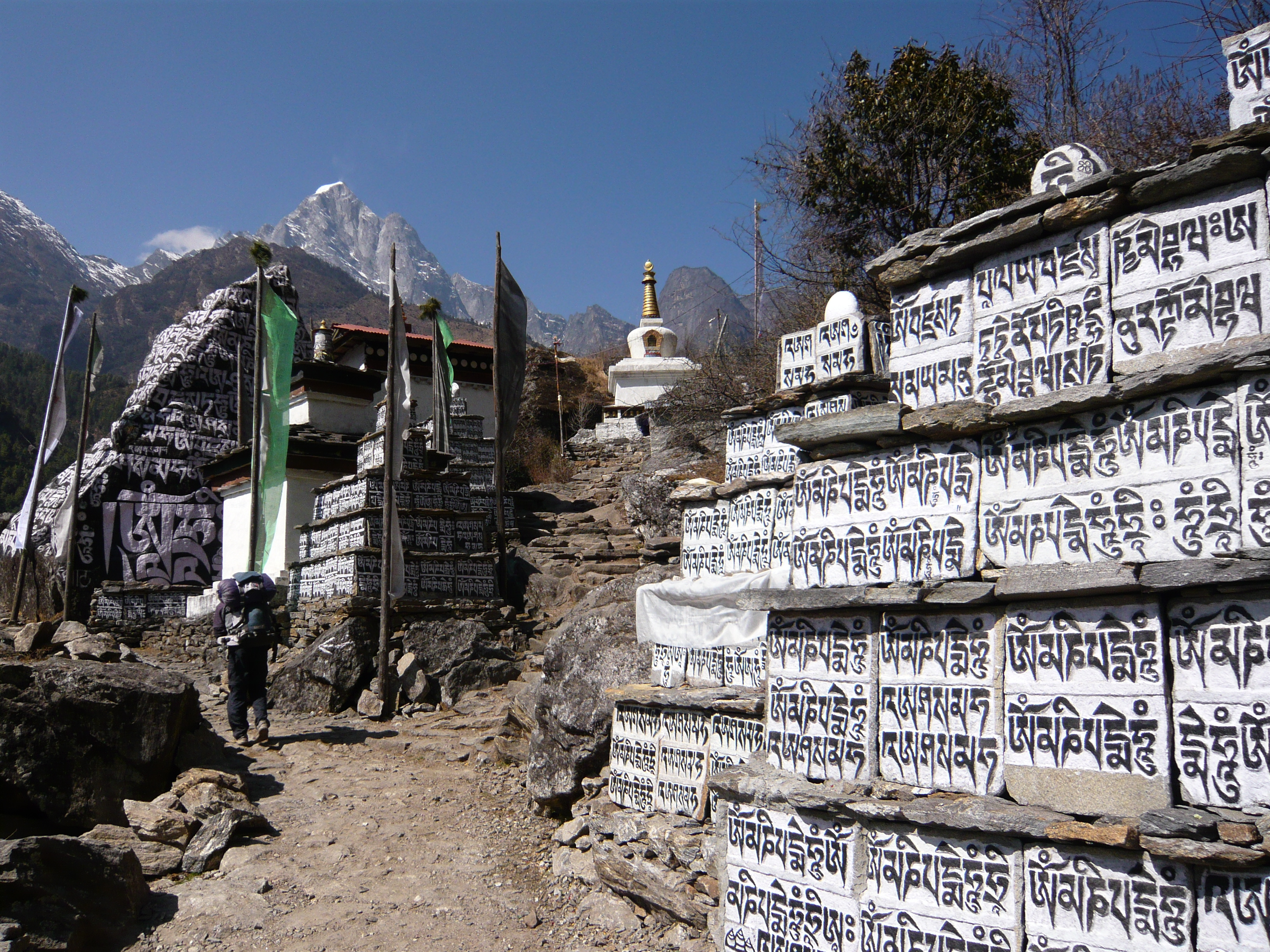 Mani stones on the Annapurna trail. Mani stones may be carved, painted or both, and serve a similar function to prayer flags, in that they either have a prayer or mantra carved on them (typically ‘Om Mani Padme Hum’ – from which the name ‘Mani Stone’ comes from – meaning ‘Hail to the jewel in the heart of the lotus’ i.e. The Buddha) or they may have a picture of the Buddha himself. Although they may be encountered singly or in small numbers by shrines or at Gompas, at times they make up huge walls containing many hundreds of stones, some of which may have been there for hundreds of years. These walls, like shrines or any other Buddhist relics encountered here, are passed on the left.