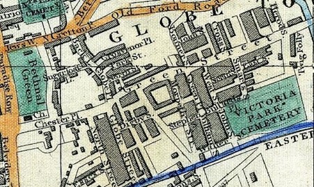 Green Street, Bethnal Green, from Cross’ Map of London 1851. Twig Folly on the right of the map gave its name to the bridge where Green Street crossed Regents Canal.