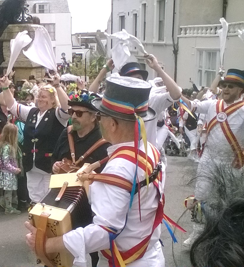 The festival in Hastings has grown over the years into a large event involving musicians, dancers, Morris sides, huge figures in addition to Jack in the Green such as the Queen of the May, a witch, and others, plus any number of people joining in the procession around the town, all decorated with as much, or as little, greenery and/or flowers as they feel suitable.