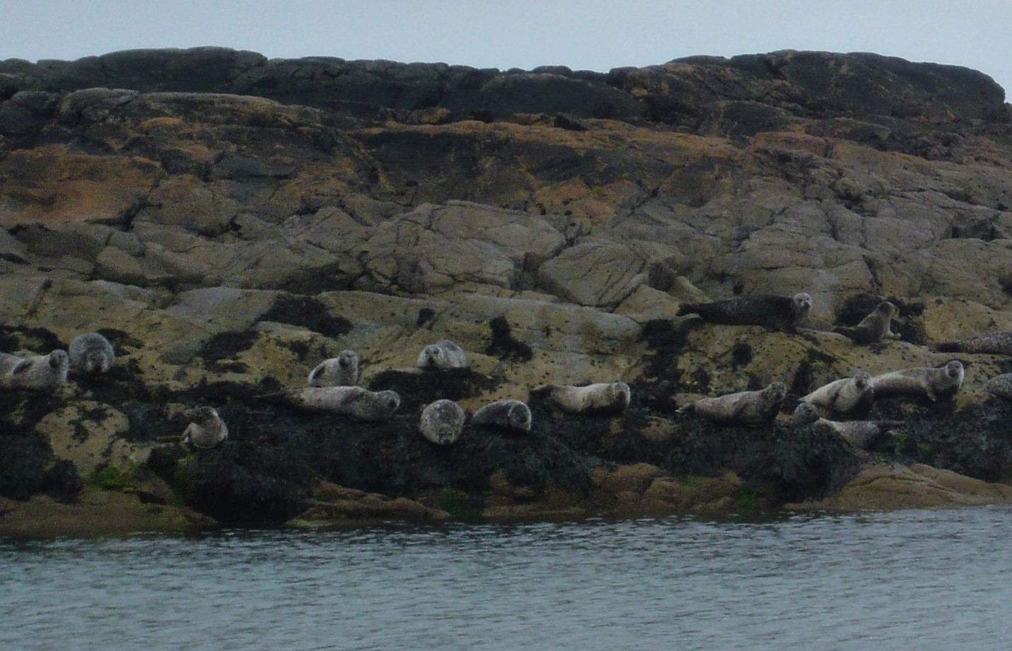 About halfway along the coast on the northern side of the island, there is a bay called Bagh an Trailleich. On our first visit, we walked there hoping to see some seals, but were disappointed. This time, there were about fifty seals on this small island in the bay