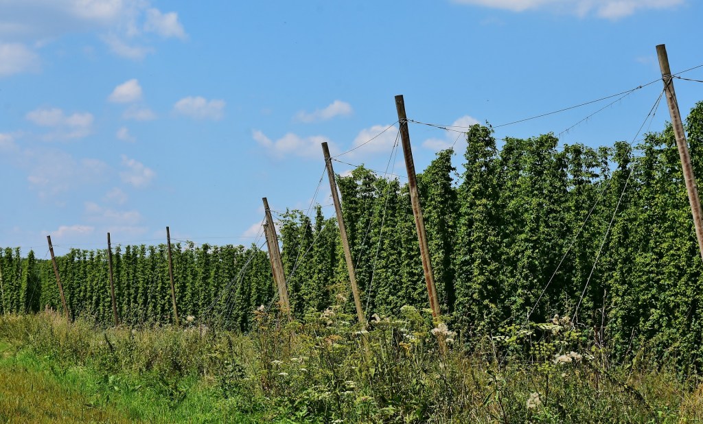 Anyway, as I said I don’t have a photo of the hop garden in question, but this one from Pixabay illustrates very nicely the hop poles and wires with the growing hop bines growing up and across them:
