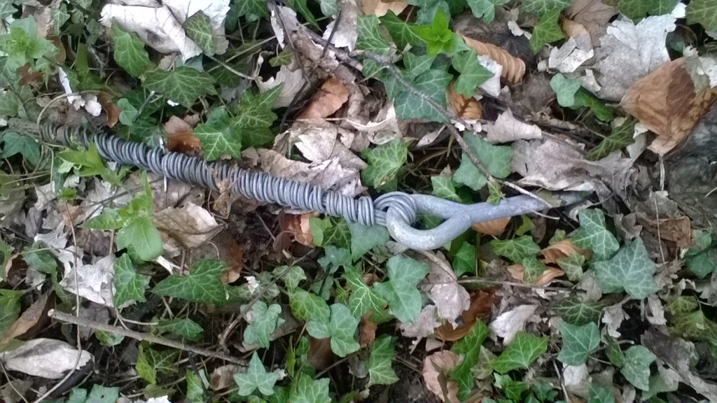 The poles were supported by wires kept under tension, anchored into the ground around the edge of the garden. Quite a few of these are still in situ around the very edge of the field and just into the woodland and hedgerows bordering it.