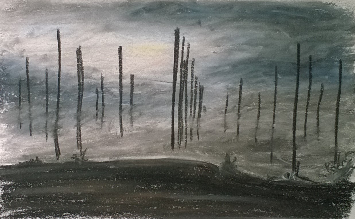 I don’t have a picture of the hop garden from back then, but late one cold, misty, autumn night about thirty years ago, I walked through it and the eeriness was instantly imprinted on me and once I was home I felt compelled to make an oil pastel painting of it (below).